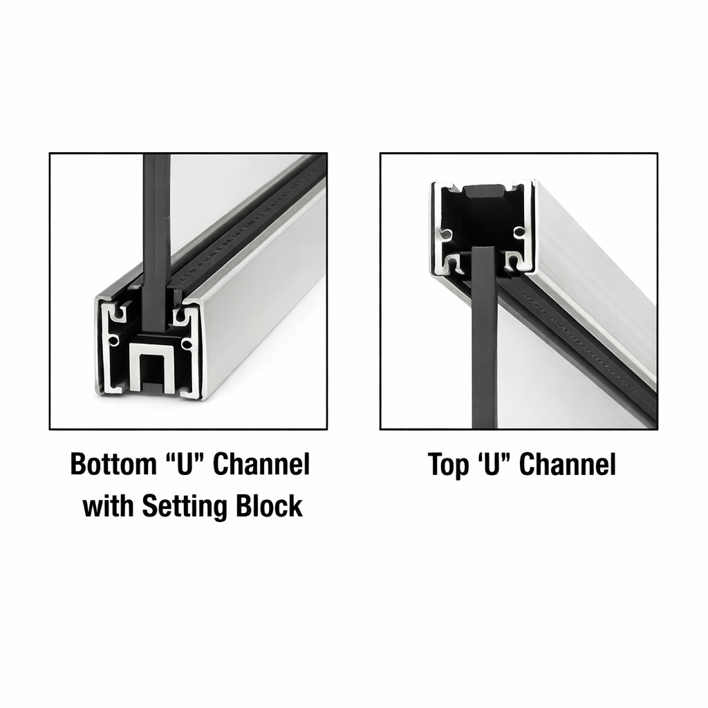 The Glaze Hardware U-Channel is specifically engineered for use with Glaze Hardware Patch Hardware and Headers for Overhead Door Closers, including installations with fixed sidelites and door rail systems. Designed for both surface and recessed mounting applications, this U-Channel provides a clean, professional finish while delivering secure glass support.
